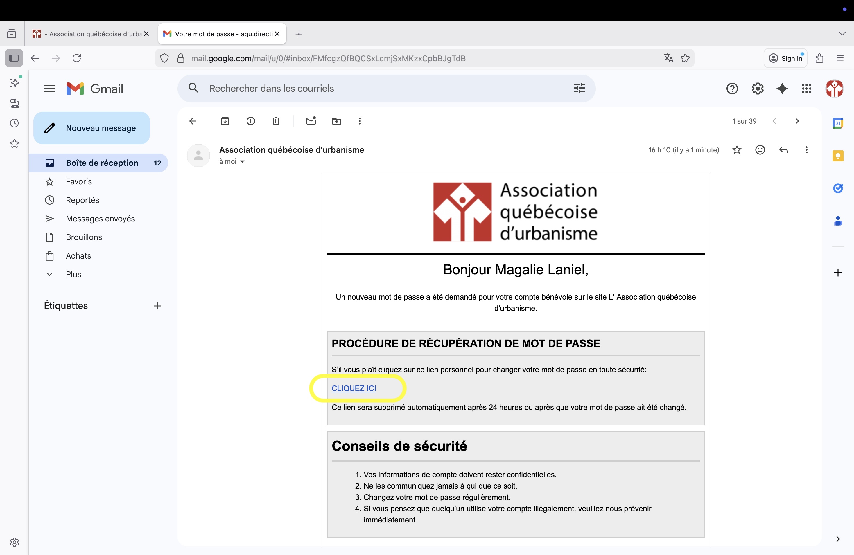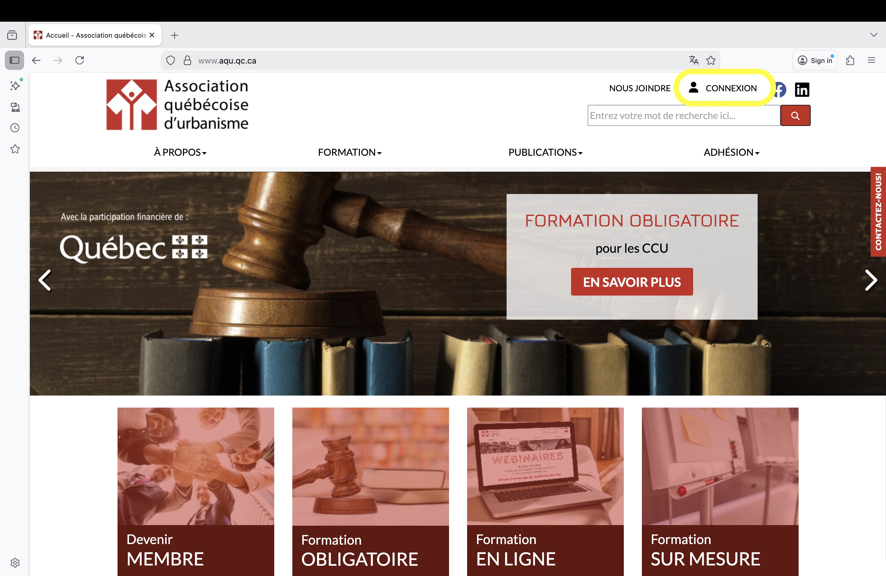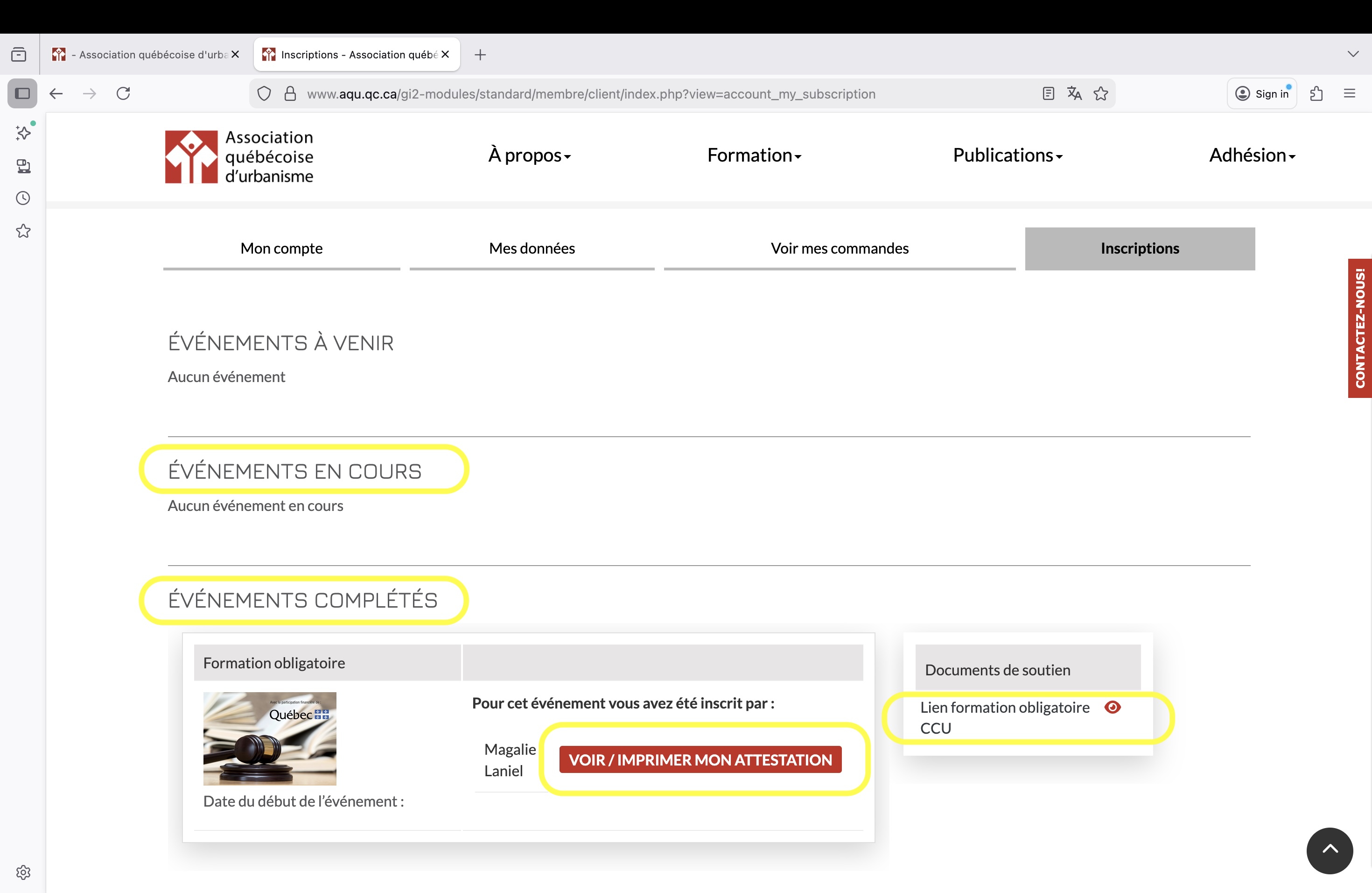 Notez que dans le cas de la Formation obligatoire pour le CCU, le lien vers la formation est aussi disponible via le document de soutient associé. Ce document est essentiellement une copie de votre courriel de confirmation d'inscription.