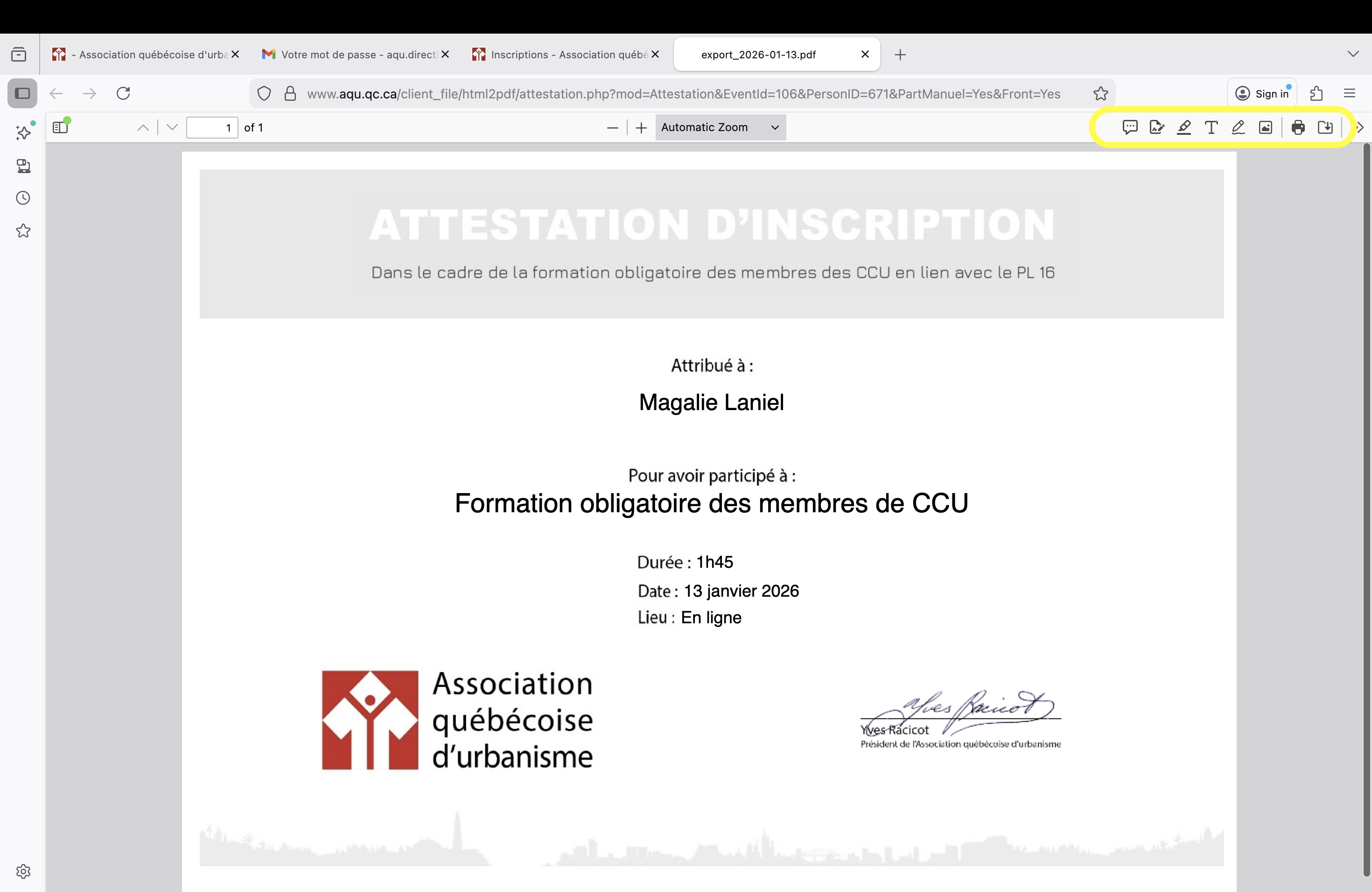 L'attestation en format PDF s'affichera a l'écran (ou se sauvegardera dans vos téléchargements) et vous pourrez ensuite l'imprimer ou la sauvegarder ailleurs.